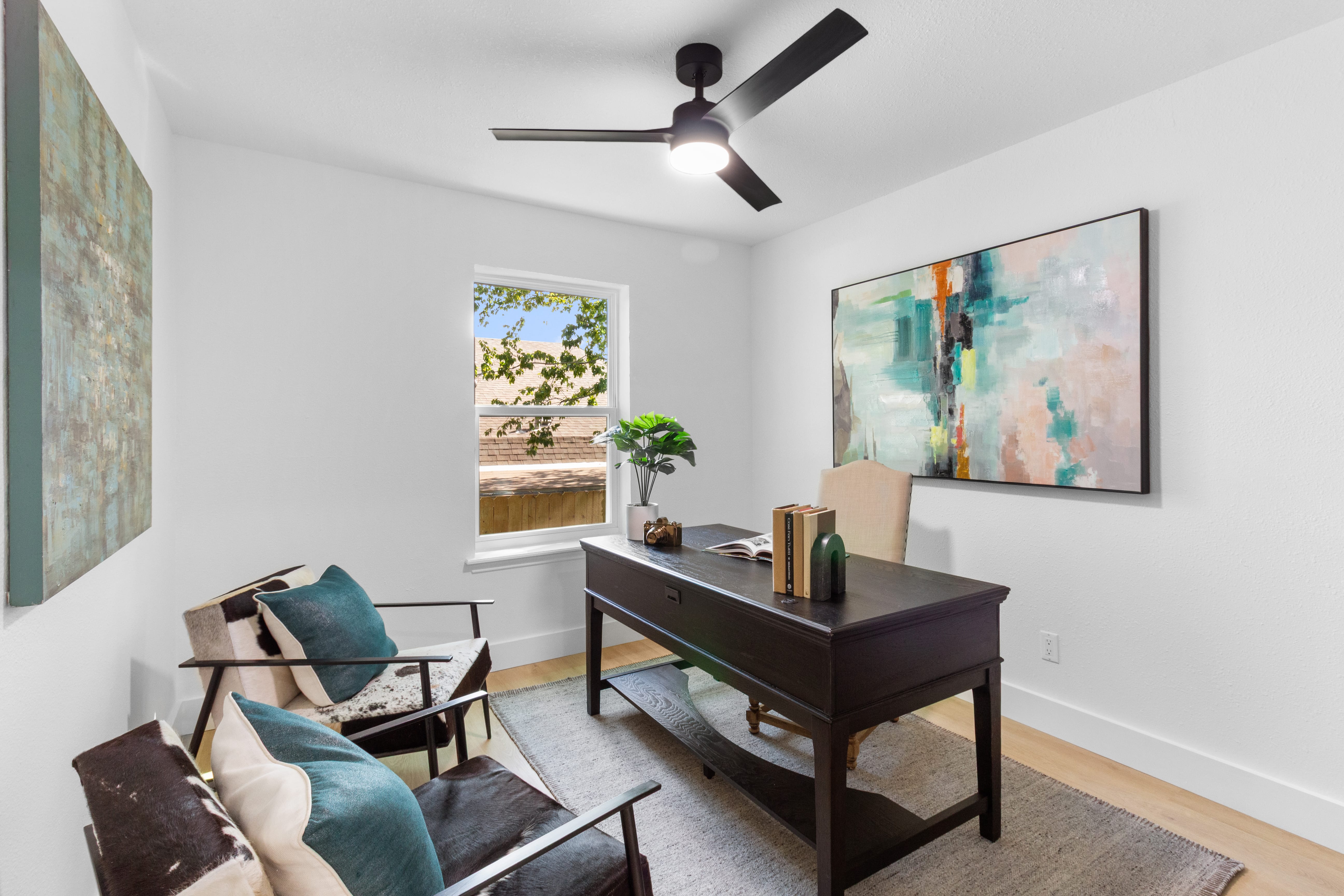 Another smaller bedroom offered a chance to show versatility. Instead of leaving it empty, we transformed it into a polished home office. We placed an executive desk with a comfortable chair to define the workspace, then added two accent chairs across the room to complete the layout and keep the space feeling balanced and inviting.