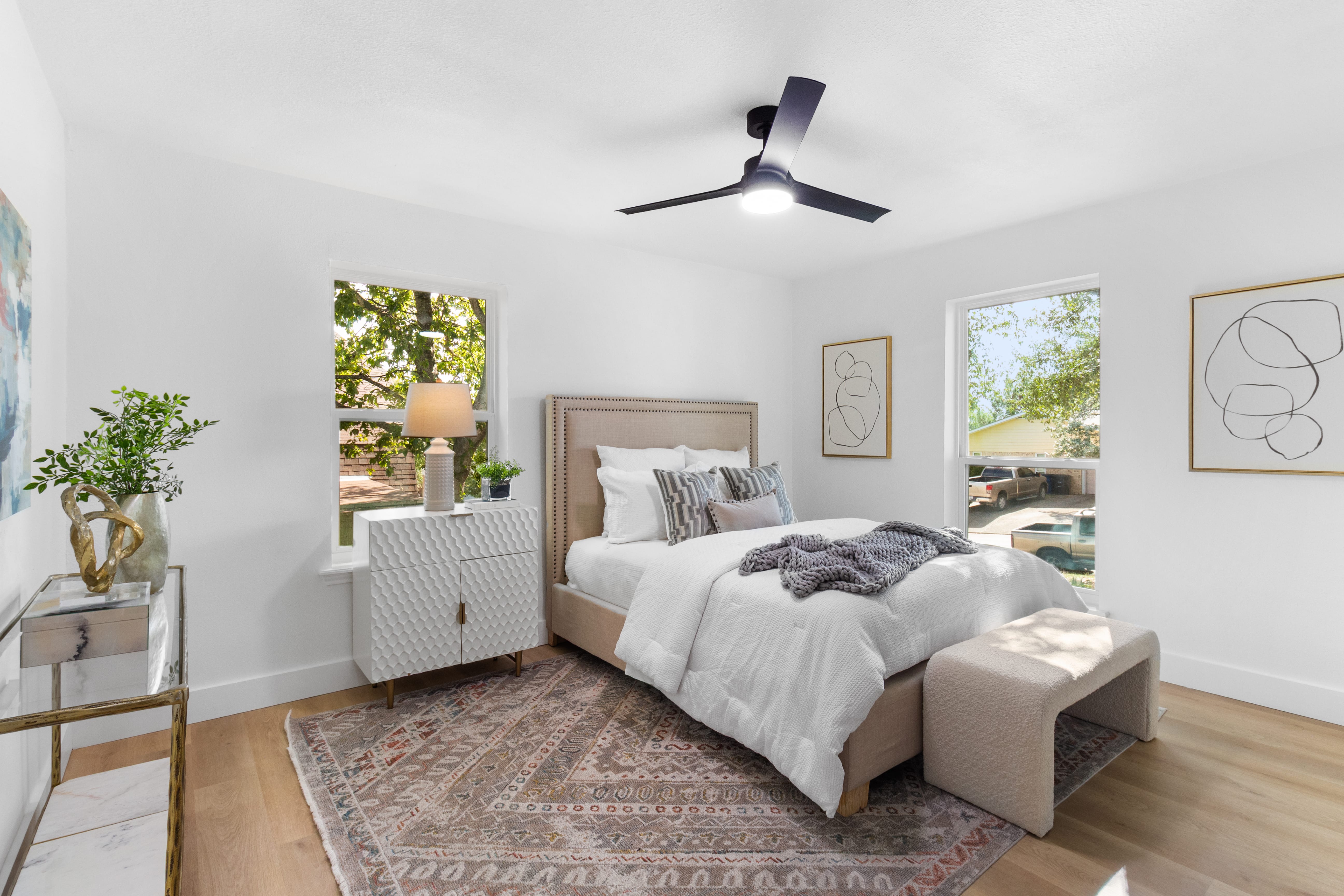 One of the secondary bedrooms also came with a unique layout. Limited square footage and unconventional window placement made it tough for buyers to imagine where a bed and nightstand could realistically fit. Thoughtful staging solved the puzzle. We used a single, large nightstand to keep the room feeling open, anchored the layout with creative rug placement, and pulled everything together with art that balanced the wall space. The room shifted from confusing to inviting, making it easy for buyers to picture real living happening there.